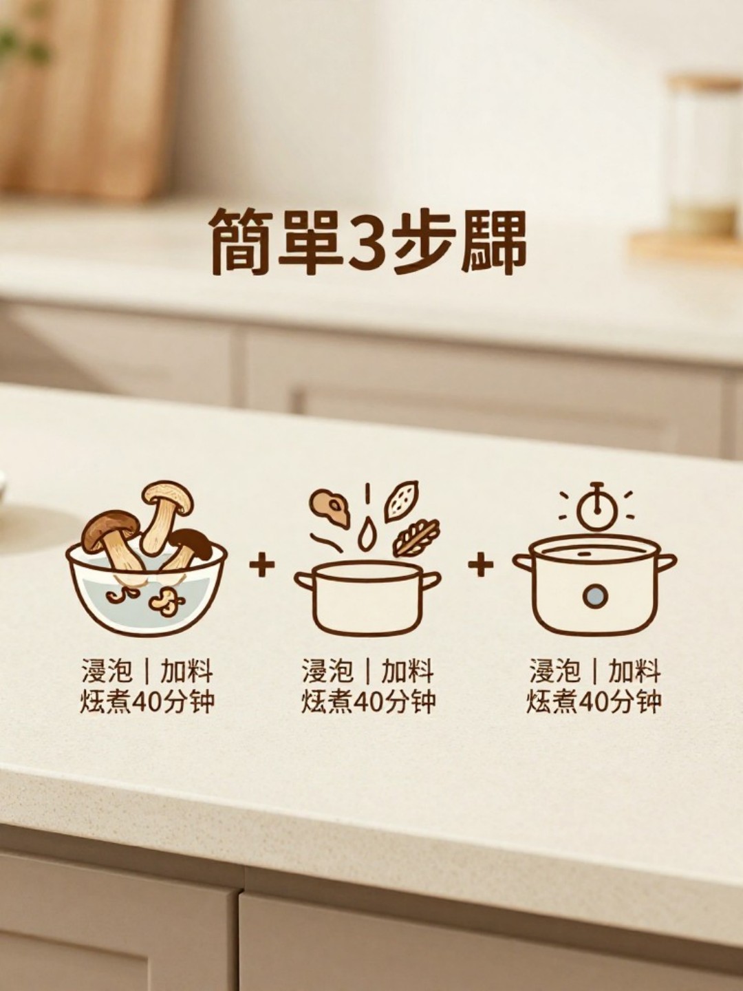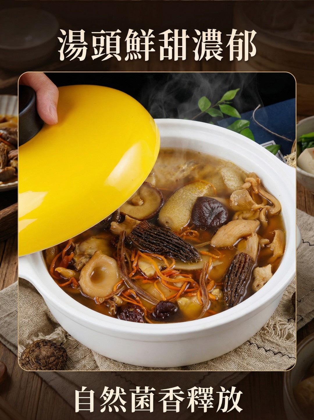 菌菇慢燉後釋放的多醣體與天然香氣湯頭清甜順口,不再依賴人工調味