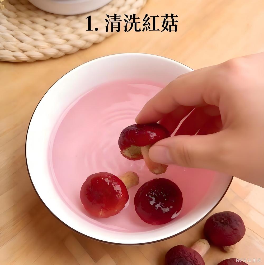 (註:天然紅菇含有紅菇素,浸泡與燉煮時湯水變紅屬自然現象,請安心食用。)