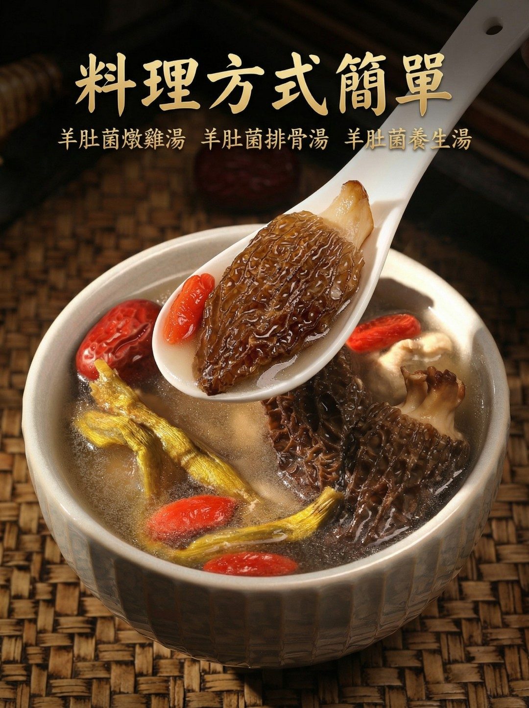 嚴選羊肚菌,自然乾燥處理,保留原始香氣與風味,燉煮後湯頭清甜鮮美。