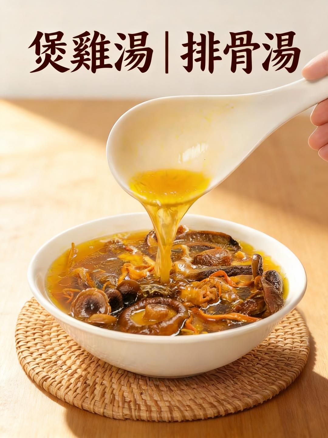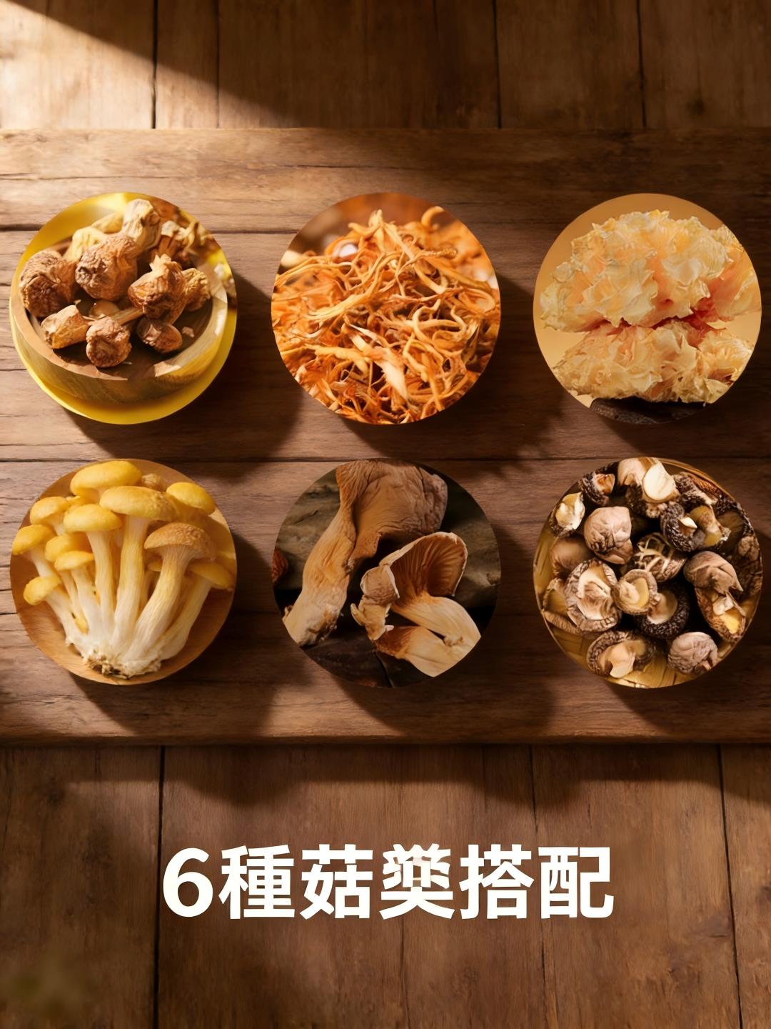 包含 **蟲草花、姬松茸、香菇、銀耳、榆黃蘑、鮑魚菇**。針對台灣家庭燉煮雞湯、排骨湯的需求,調配出鮮味、口感與營養兼具的完美組合。