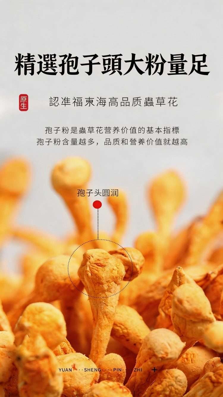 孢子粉是蛹蟲草花營養價值的基本指標,孢子含量越多,品質和營養價值就越高。我們精心挑選的蛹蟲草花,孢子頭大而飽滿,粉量充足,確保每一份產品都具有最佳的營養價值。